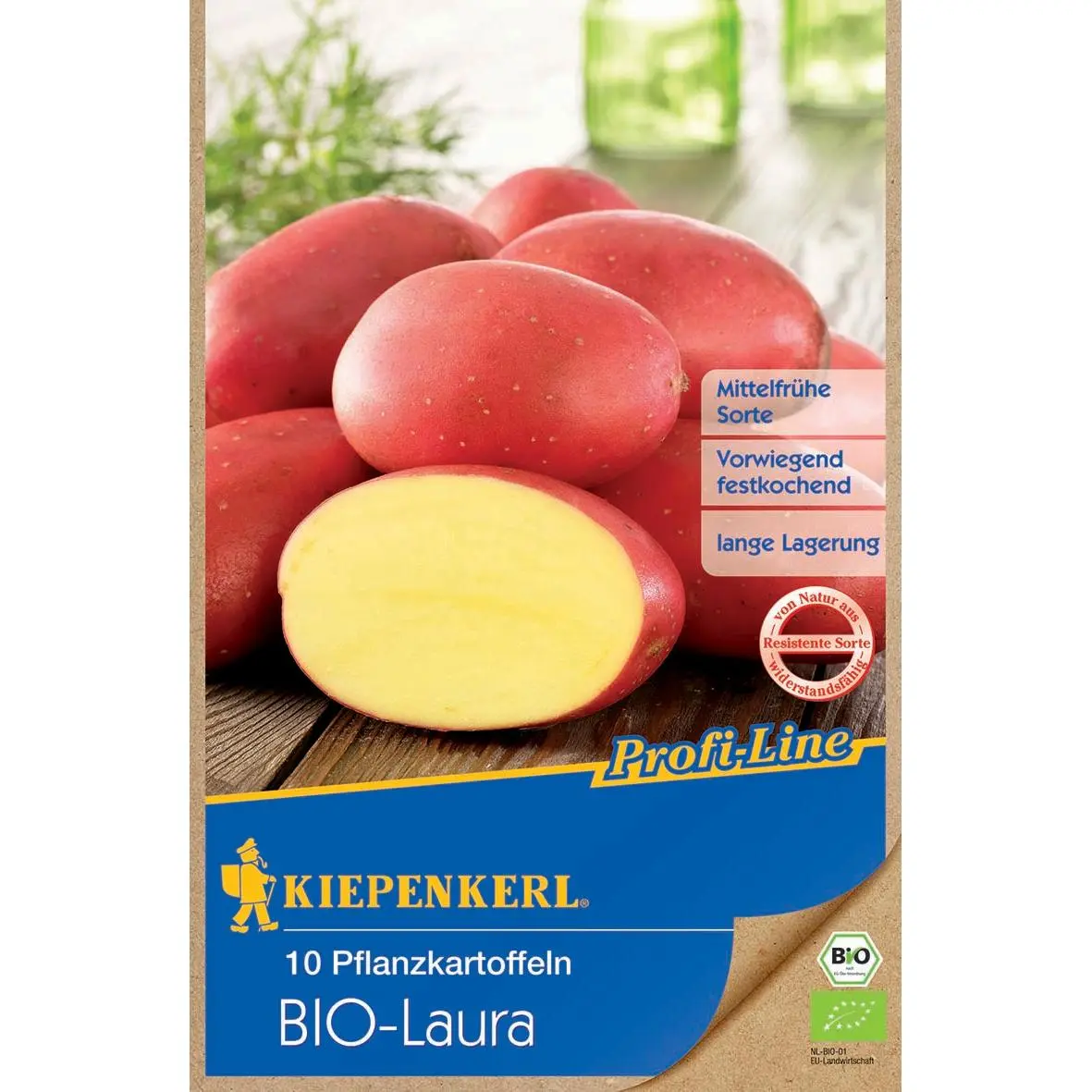 Die mittelfrühe Profi-Line-Sorte ‘BIO-Laura’ ist eine vorwiegend festkochende Speisekartoffelsorte. ‘BIO-Laura’ wird im April gepflanzt und lässt sich im August ernten. Sie bevorzugt einen sonnigen bis halbschattigen Standort und ist resistent gegen Fadenwürmer. Die rund bis ovalen Knollen haben eine glatte, rote Schale und extrem gelbes Fruchtfleisch. Dadurch das ‘BIO-Laura’ eine gute Lagerfähigkeit aufweist, kann man lange Nutzen von ihr ziehen.