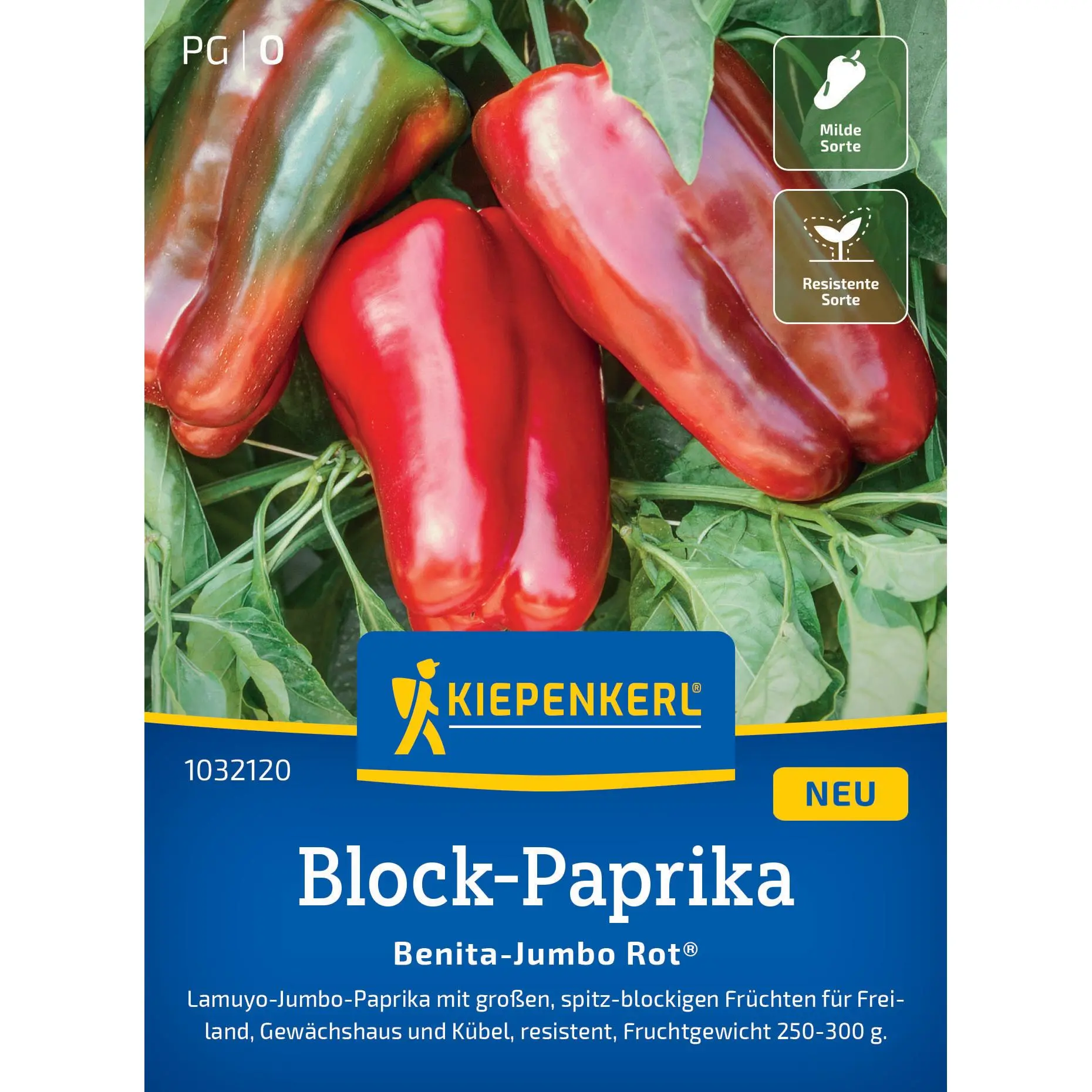 Die Jumbopaprika ‘Benita-Jumbo Rot®’ bildet dickwandige, spitz-blockige, von Grün nach Rot reifende, 250-300 g schwere Früchte. Grüne Früchte haben ein fein-würziges, rote ein fruchtig süßes Aroma. Ideal zum Füllen und Kochen. Für geschützte Stellen im Freiland, Gewächshaus, Hochbeet und Kübel. Resistent gegen Mosaikvirus. Wuchshöhe 80-100 cm.
